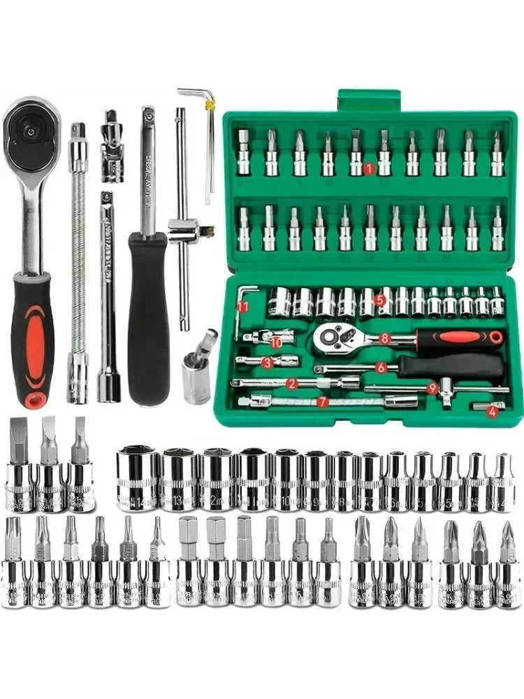 46pc Drive Socket Set 1/4 inch Ratchet Wrench Set with Sockets Metric Hex Bit Socket Set Mechanic Tool Kits for Hous Auto Repair
