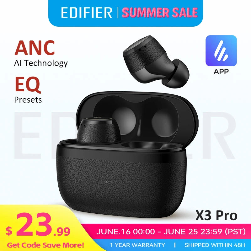 Regular price From $59.98 USDSale price From $59.98 USD Regular priceUnit price per$59.98 USDSale Sold outSPECIFICATIONSActive Noise-Cancellation: YesBluetooth Version: 5.4Brand Name: EdifierCategory: Earphones & HeadphonesCertification: CECharging Method: Charging caseCodecs: sbcCommunication: True wirelessConnectors: Type cDriver Diameter: 8Edifier Model: X3 ProFeatures: Waterproof,With microphone,Active...