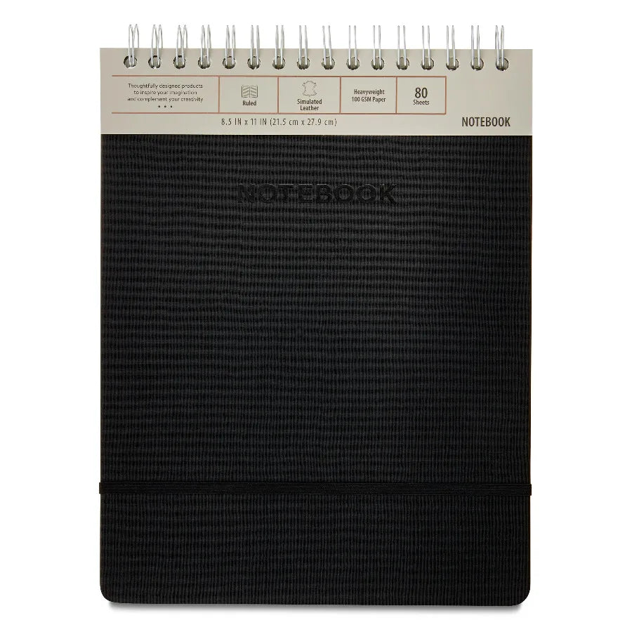 Top Spiral Simulated Leather Notebook, Black, 8.5" x 11", 80 Ruled Sheets
