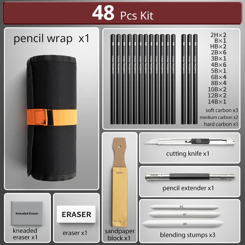 48Pcs Drawing Kit Sketching Pencils Set,Portable Pen Curtain-Charcoal Pencils, Sketch Pencils, Charcoal Stick,Sharpener,Eraser