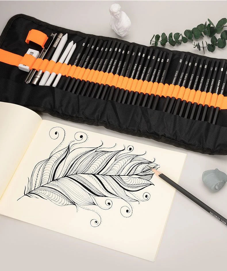 48Pcs Drawing Kit Sketching Pencils Set,Portable Pen Curtain-Charcoal Pencils, Sketch Pencils, Charcoal Stick,Sharpener,Eraser