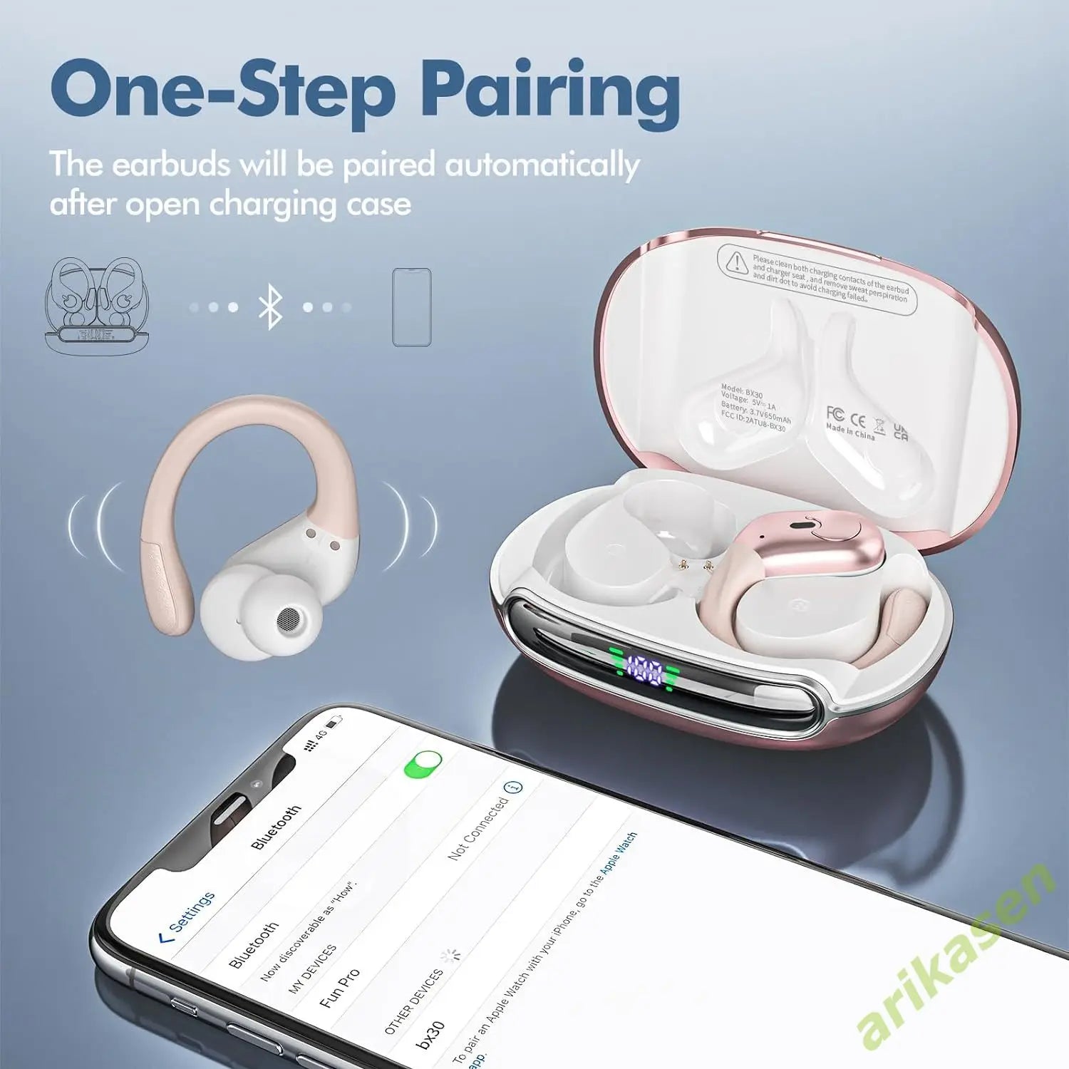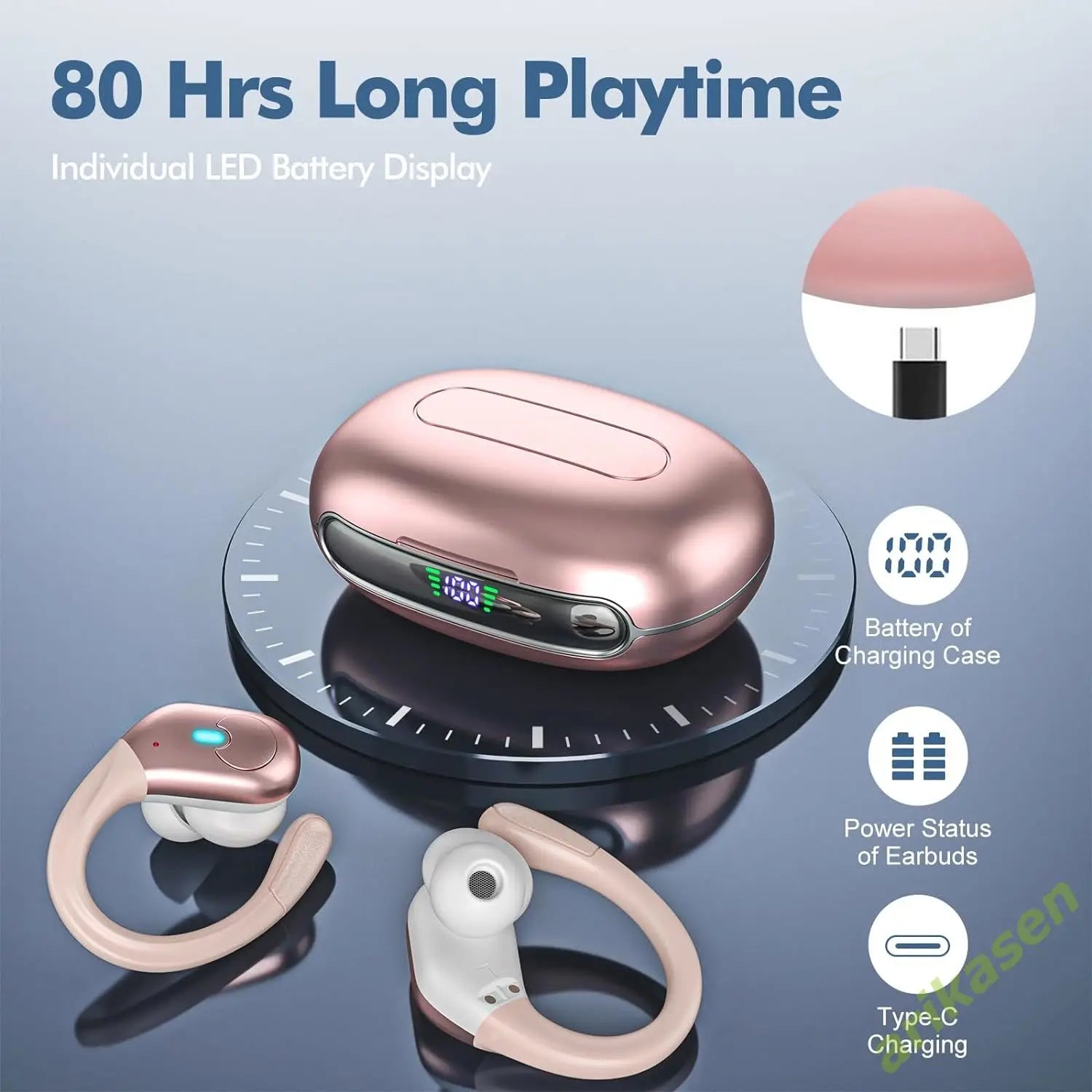Wireless Earbuds Bluetooth Headphones 80Hrs Playback with LED Diaplay Wireless Charging Case Noise Cancelling Ear Buds with Earhooks, Over Ear Earphones for Sports Running Workout (Rose Gold)