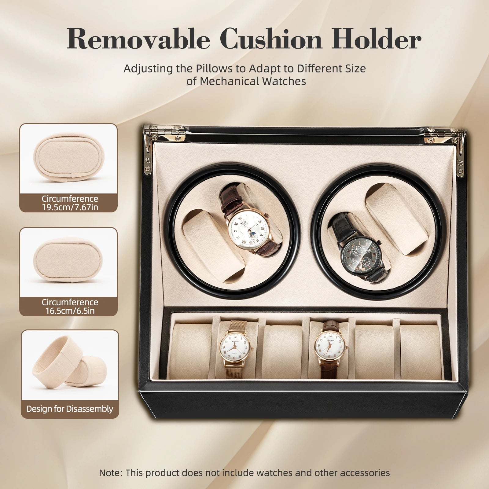 Large Capacity: 4 rotating display compartments and 6 storage compartments allow you to store up to ten watches inside at once. With a single watch winder, you can solve the storage problem for your and your family's watches.